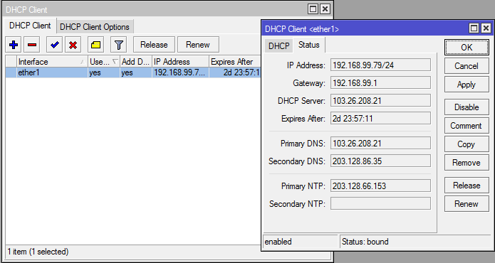selanjutnya silahkan di cek di menu ip dhcp client , bila  sudah dapat ip ( bound ) berarti langkah ini sudah berhasil .